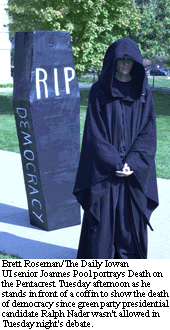 UI Students for Ralph Nader mourned the death of democracy Tuesday afternoon in a protest against the exclusion of Green Party presidential candidate from Tuesday night's presidential debate in St. Louis.